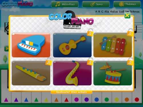 Color Piano : Initiation au solfège propose au enfants d'utiliser les symboles et les couleurs pour jouer des mélodies et apprendre le solfège. La version gratuite de l'application comporte le piano, 2 thèmes (image de fond) et plusieurs mélodies.